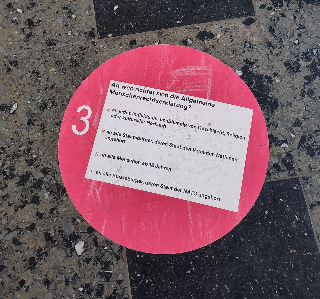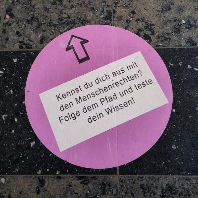 Konkret zu „betreten“ war ein „Pfad der Menschenrechte“, der von Schülerinnen der 9. Klasse installiert wurde. Er beginnt in der Pausenhalle und führt mit nicht zu übersehenden farbigen Kreisen bis zur Allgemeinen Erklärung der Menschenrechte am Eingang unserer Schule.