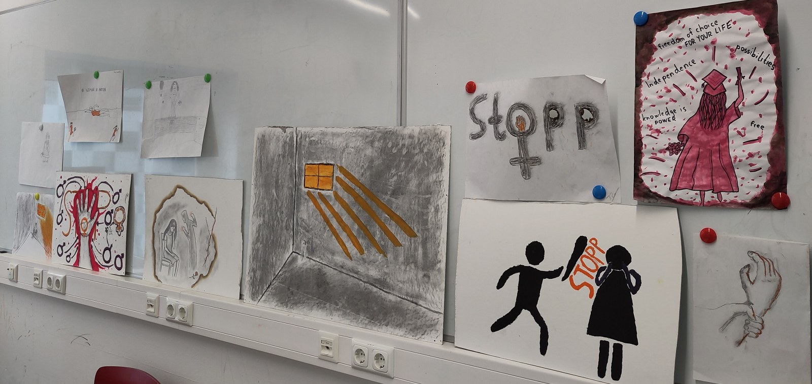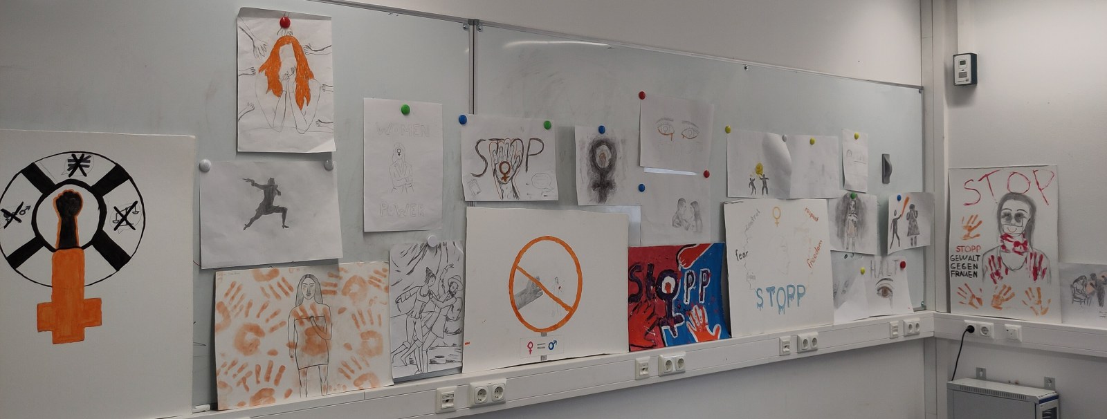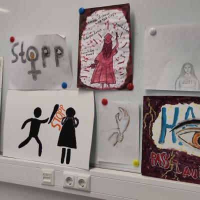 Dort, in der Ecke hinter den Aquarien, machen Kunstwerke aus der Klasse 11 c deutlich, dass Gewalt keine Lösung ist und alle Menschen die gleichen Rechte haben.