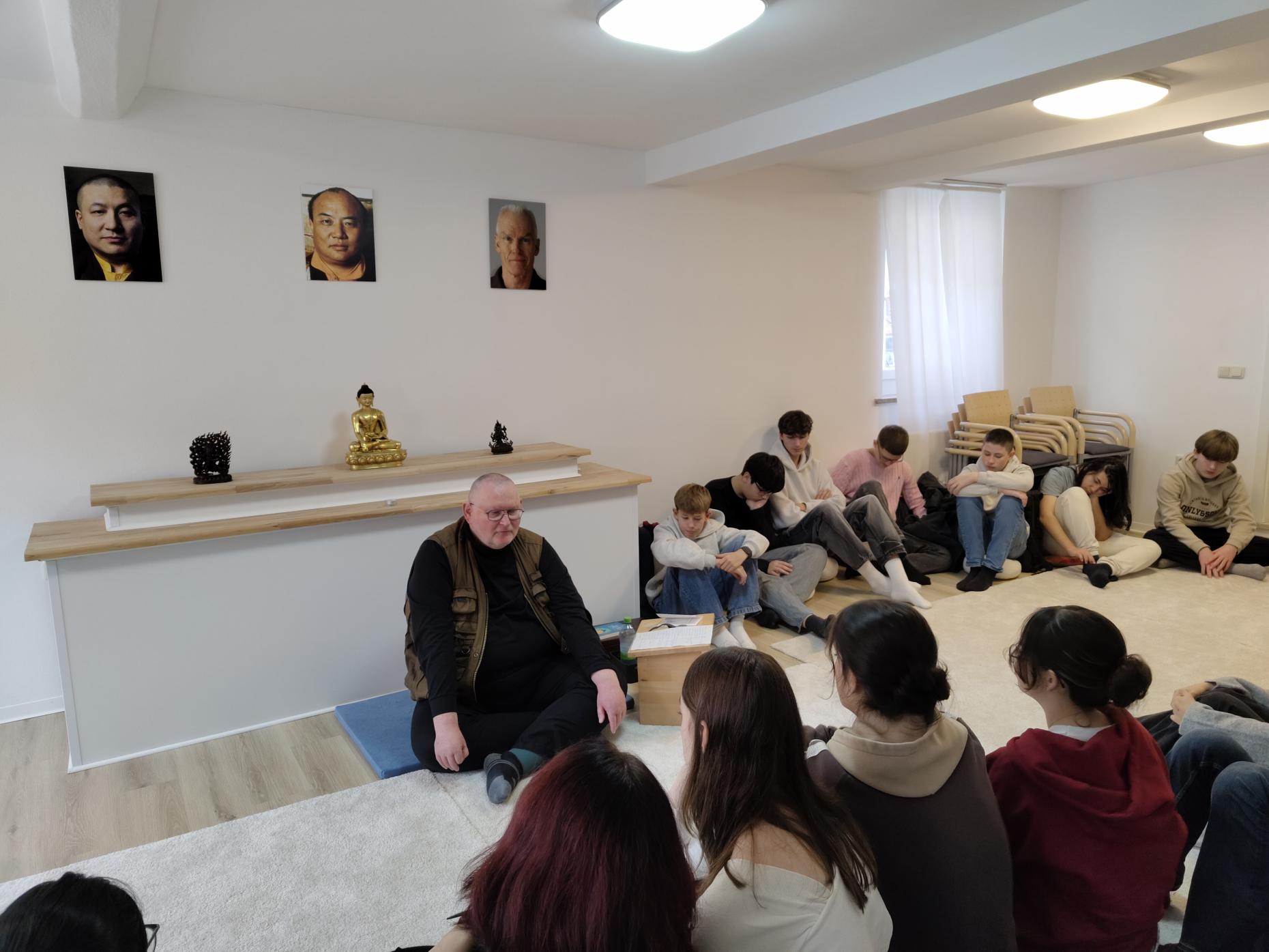 Wir vertiefen unser Wissen über Siddhartha Gautama und seinen Pfad zum Buddha, dürfen alle Fragen stellen, die uns auf den Nägeln brennen und bekommen bereitwillig Auskunft erteilt. Eine Meditation auf freiwilliger Basis rundet unseren lehrreichen Besuch im buddhistischen Zentrum ab. Für die Erleuchtung hat es noch nicht gereicht, aber für einen Einblick in die faszinierende fernöstliche Religion. Vielen Dank für die Gastfreundschaft sagen Herr Kerling und seine neunte Klasse Ethik!