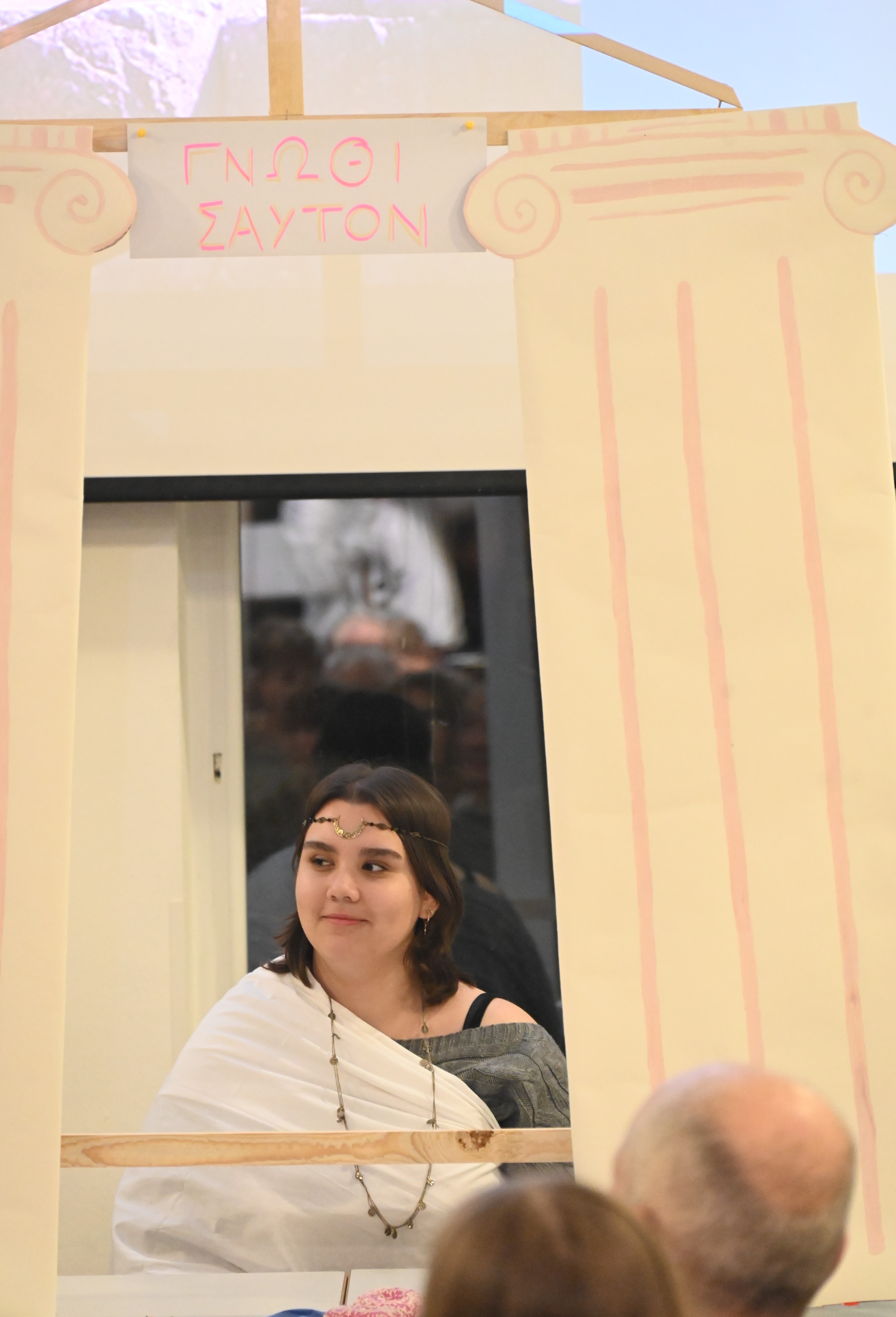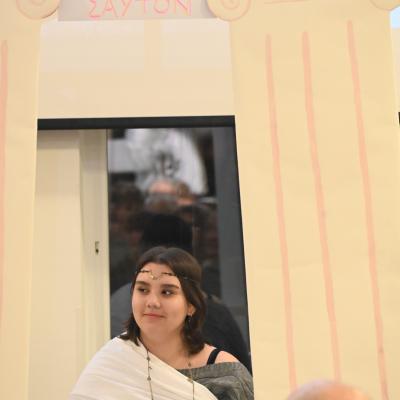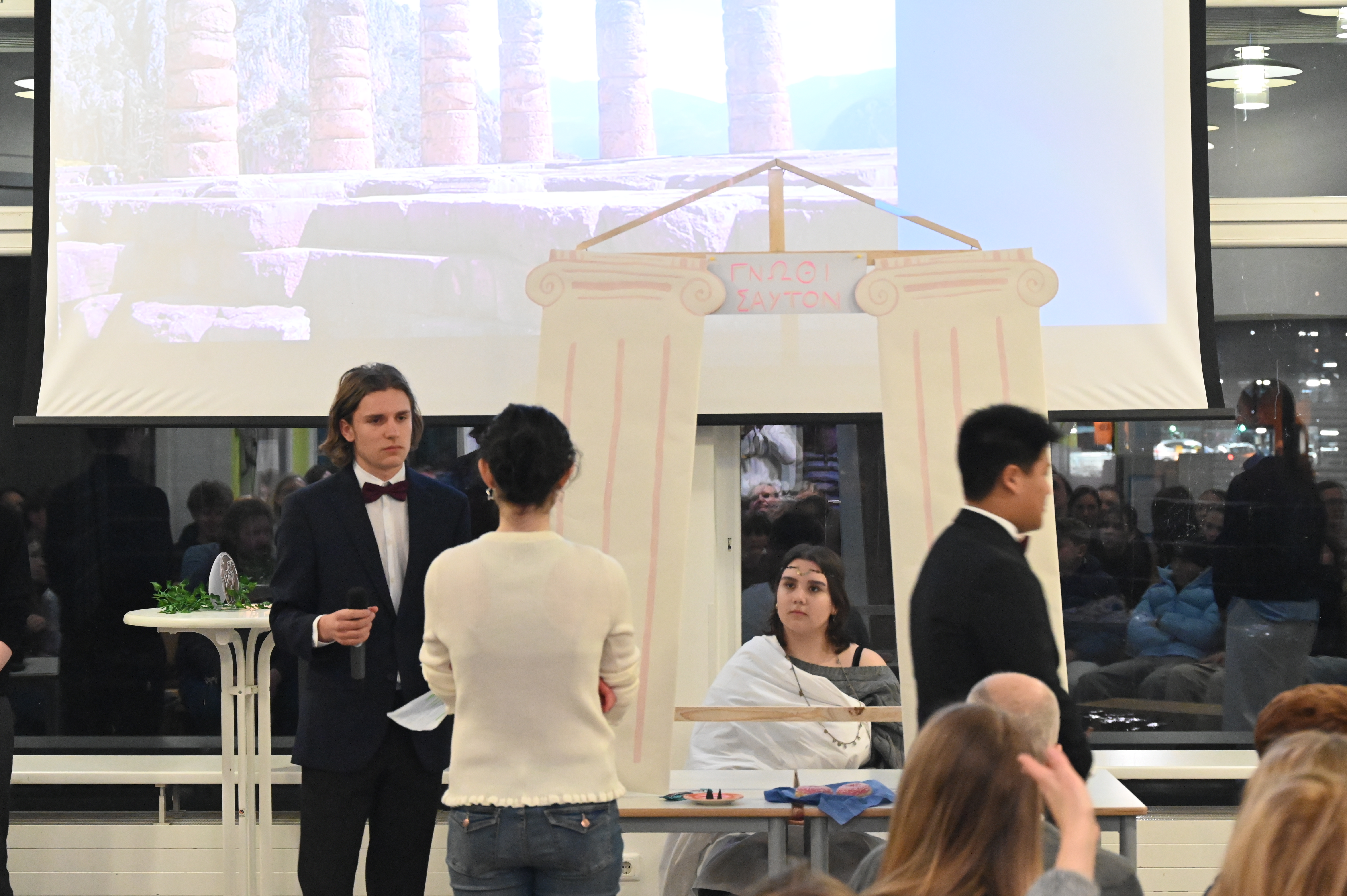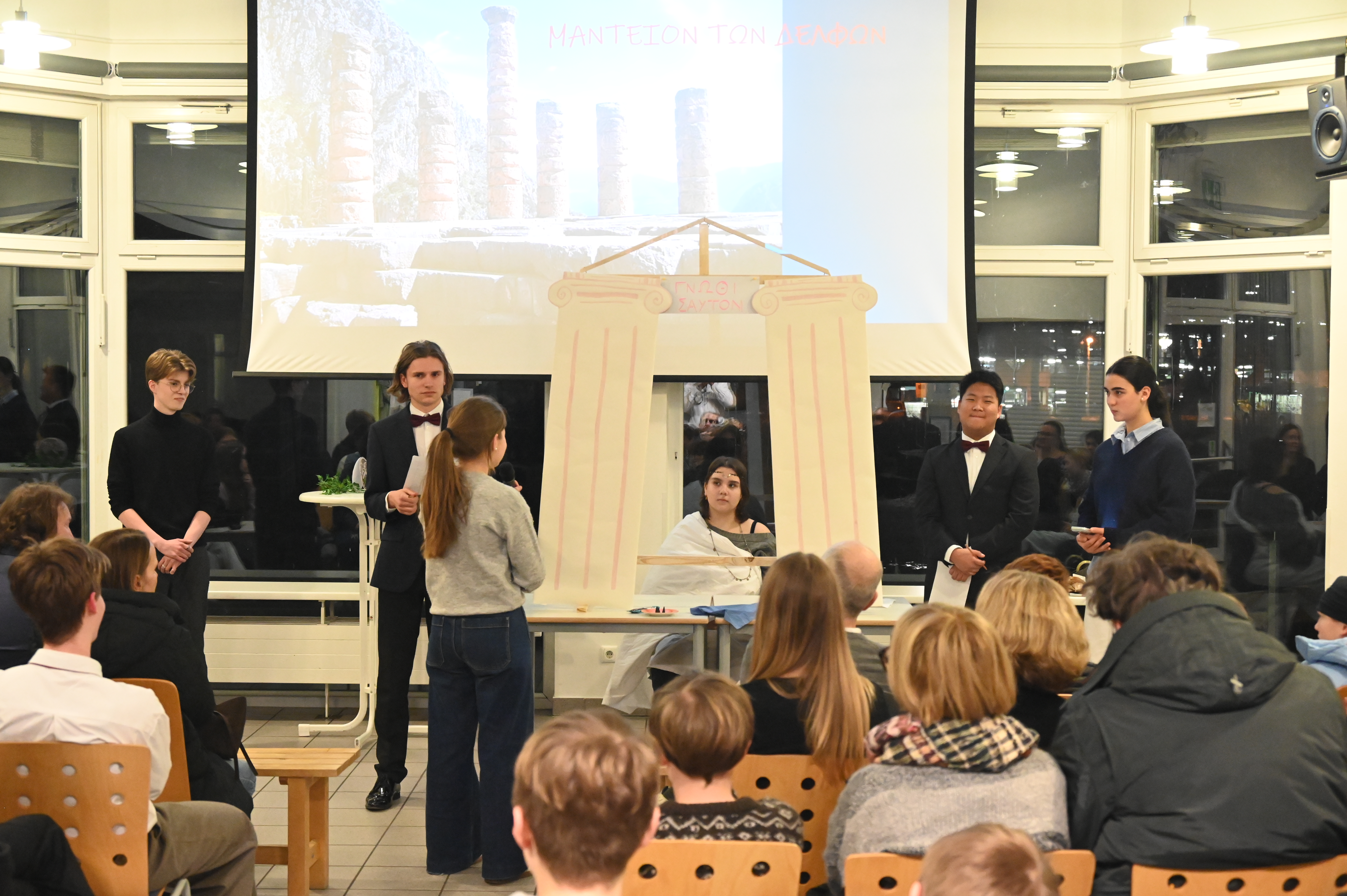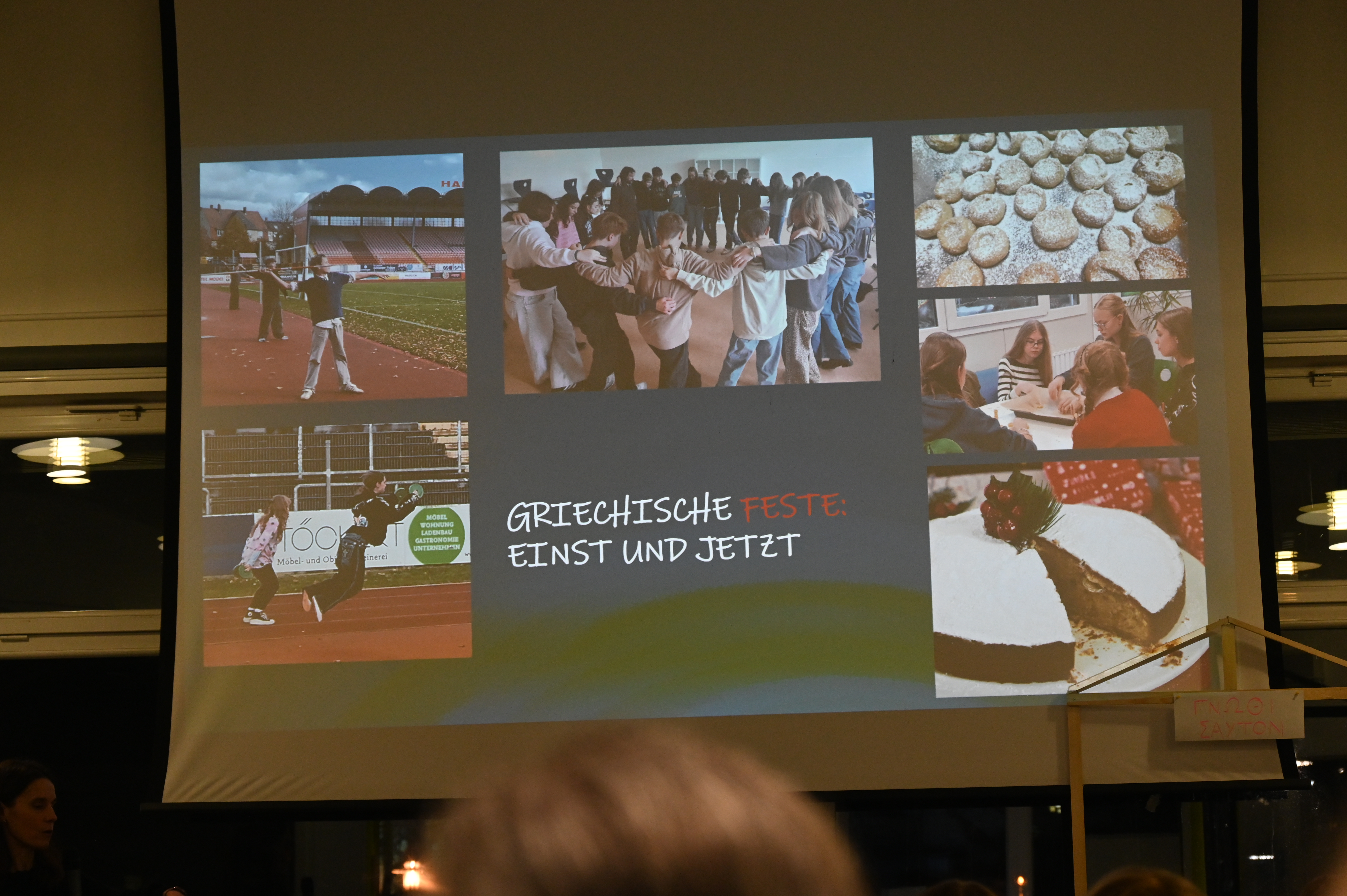 Humorvolle Beiträge, wie Spots der alten Götter und die Fotostory zur Kirkeepisode regten zum Schmunzeln an, die fiktive Begegnung zwischen Trump und Sokrates sowie der tragische Konflikt in der Antigone zum Nachdenken. Aktiv dabei waren die Zuschauer beim Tanzen des Syrtaki und beim Befragen des delphischen Orakels. Voll Begeisterung präsentierten Schülerinnen und Schüler der 12. Jahrgangsstufe Fotos von ihren Erlebnissen beim Austausch mit der deutschen Schule Athen und ihrer mehrtägigen Griechenlandrundfahrt.