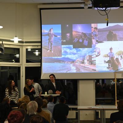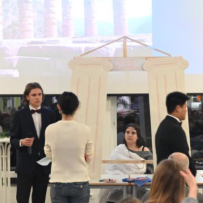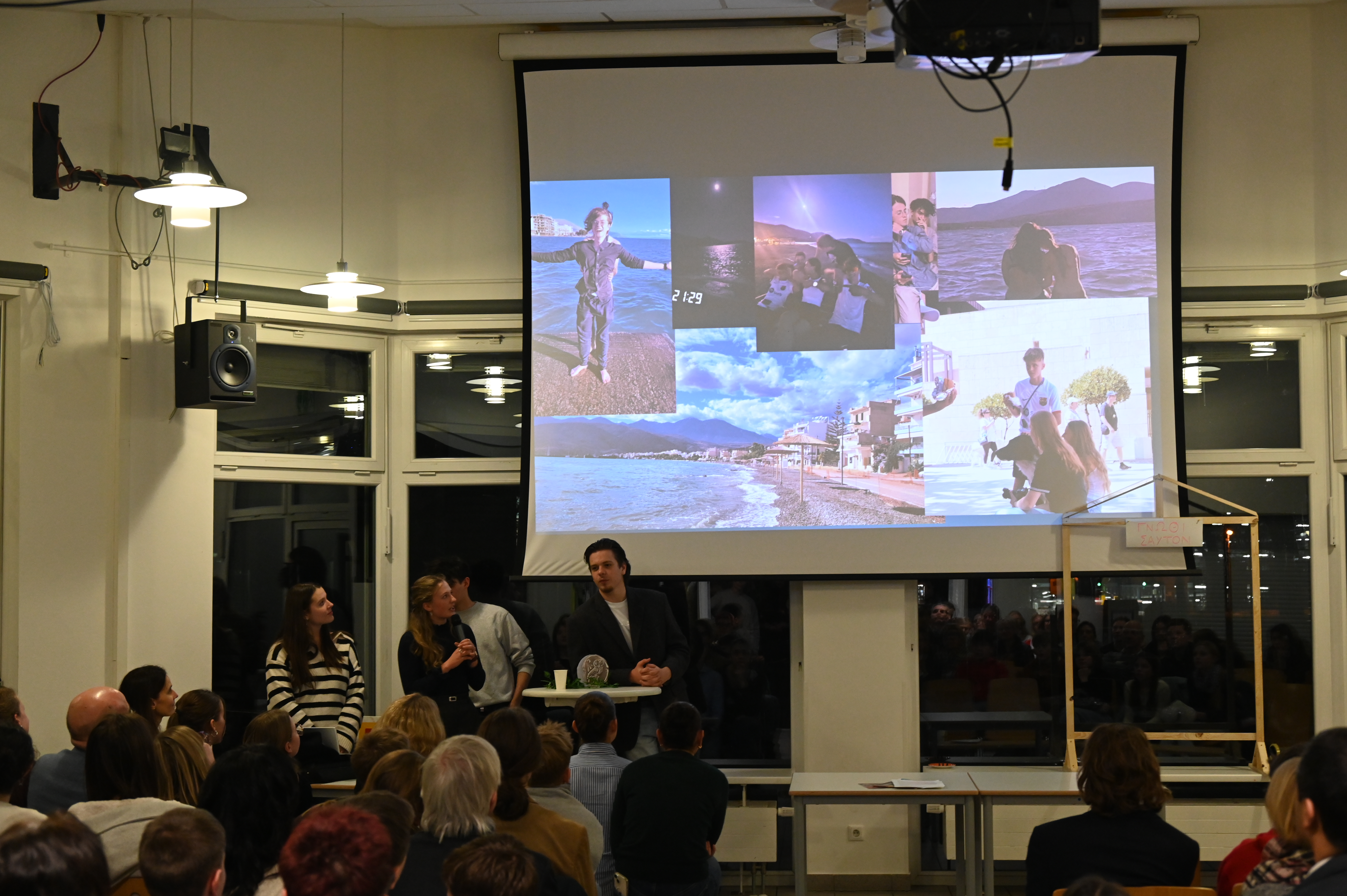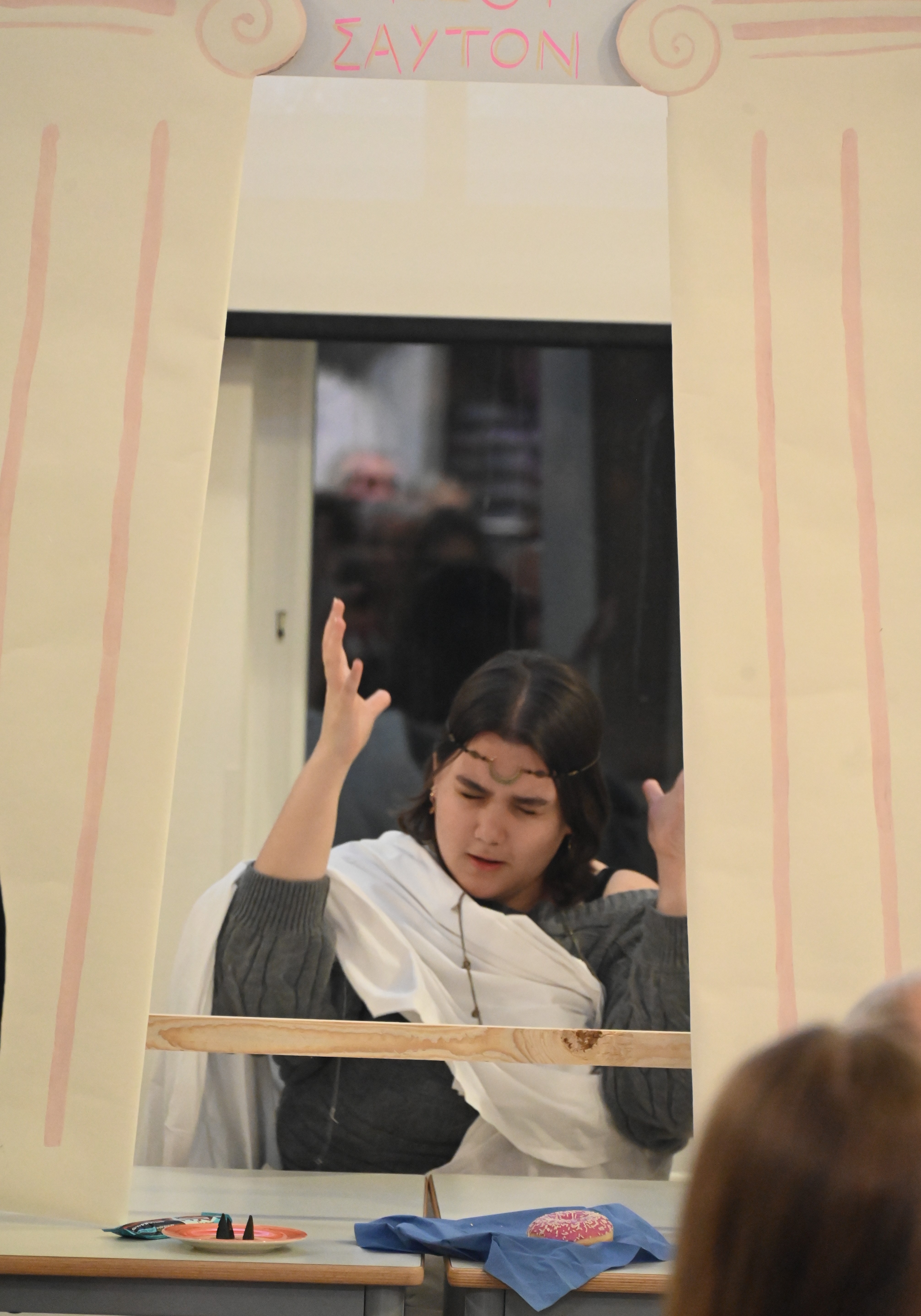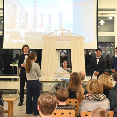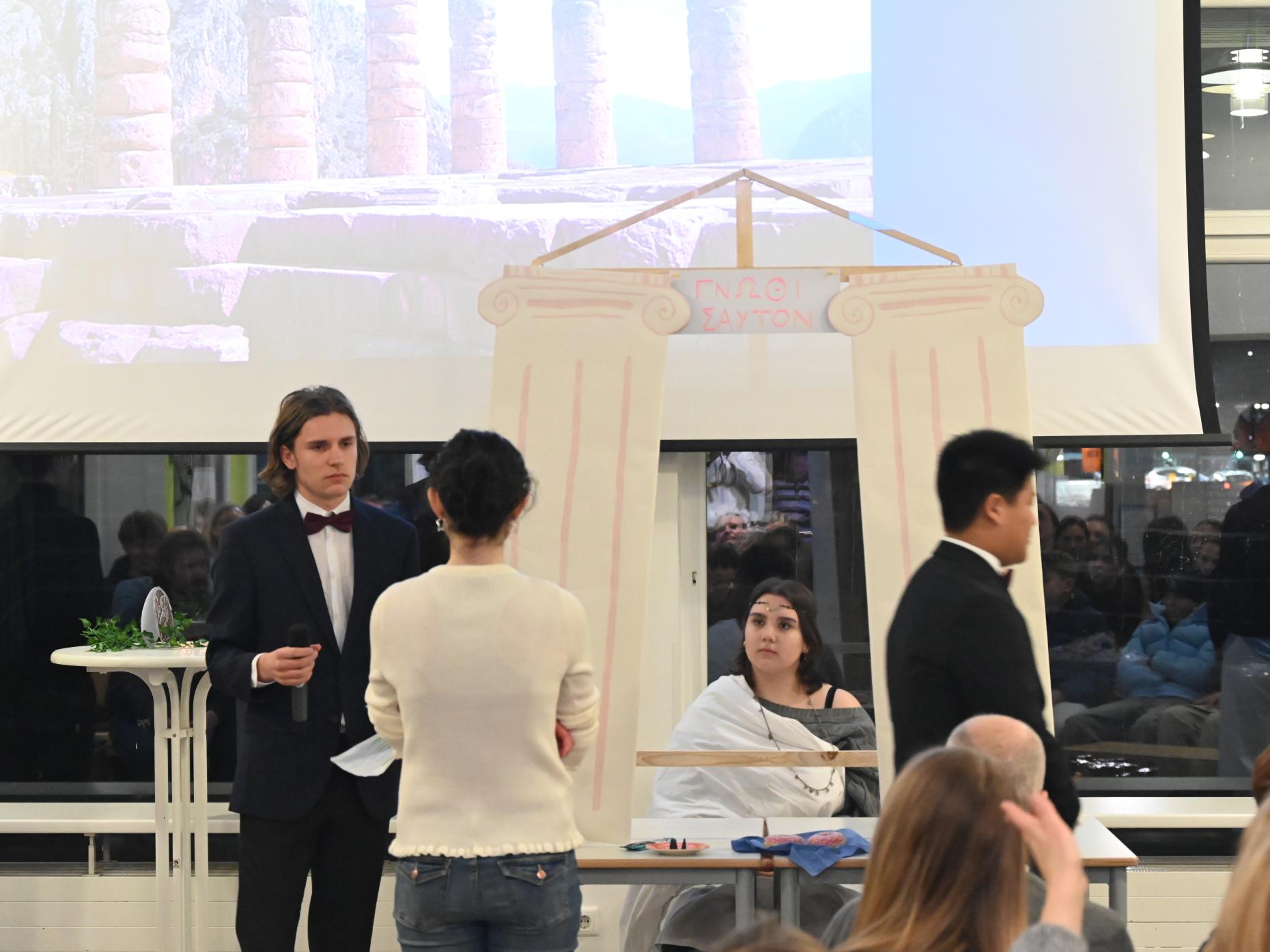 Humorvolle Beiträge, wie Spots der alten Götter und die Fotostory zur Kirkeepisode regten zum Schmunzeln an, die fiktive Begegnung zwischen Trump und Sokrates sowie der tragische Konflikt in der Antigone zum Nachdenken. Aktiv dabei waren die Zuschauer beim Tanzen des Syrtaki und beim Befragen des delphischen Orakels. Voll Begeisterung präsentierten Schülerinnen und Schüler der 12. Jahrgangsstufe Fotos von ihren Erlebnissen beim Austausch mit der deutschen Schule Athen und ihrer mehrtägigen Griechenlandrundfahrt.