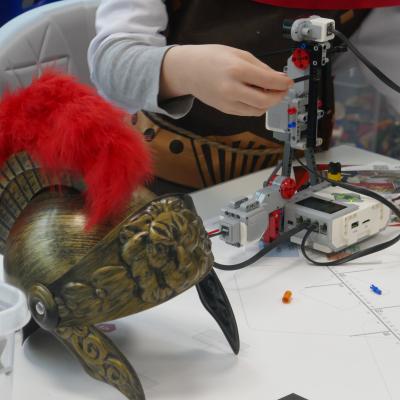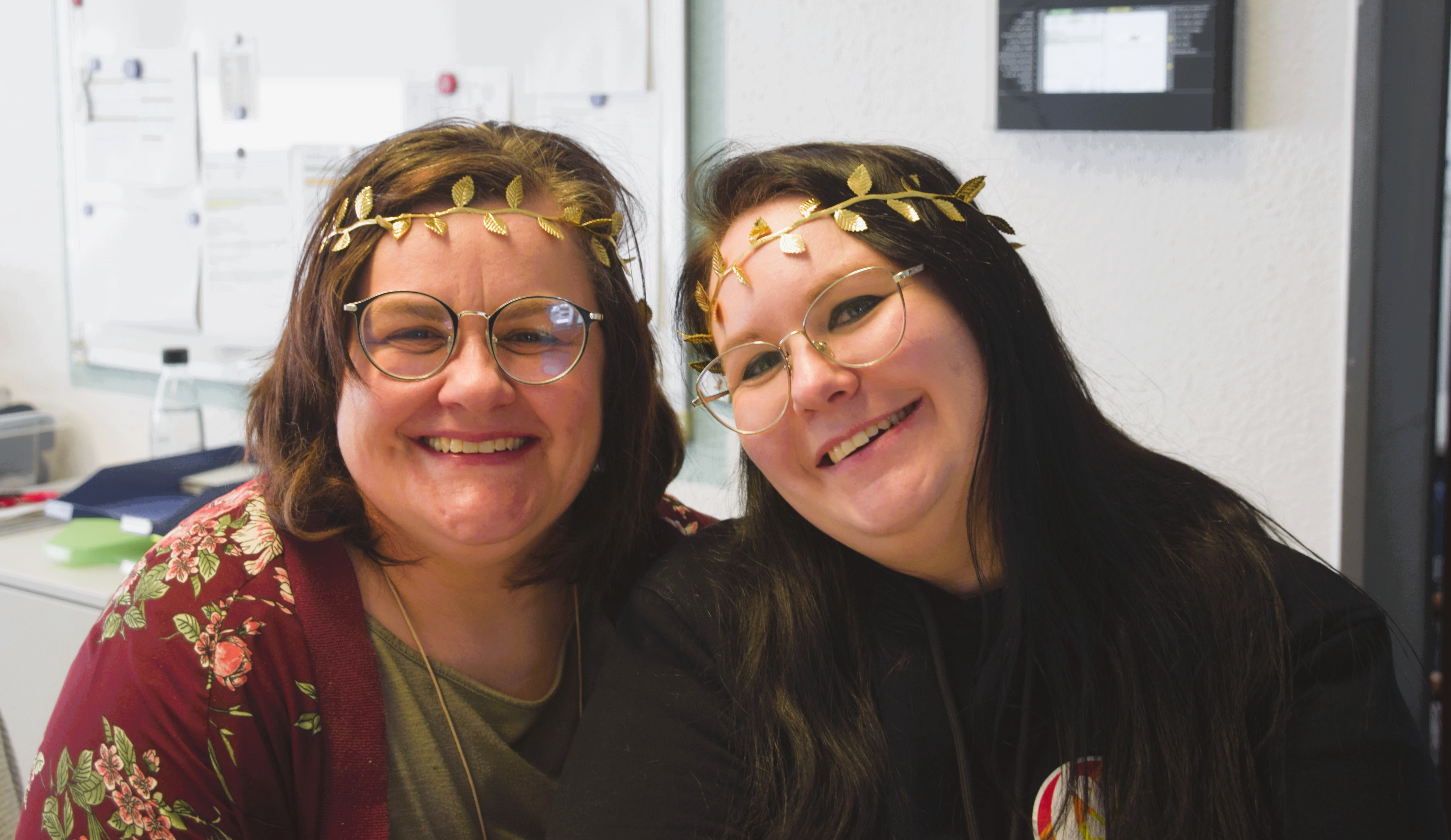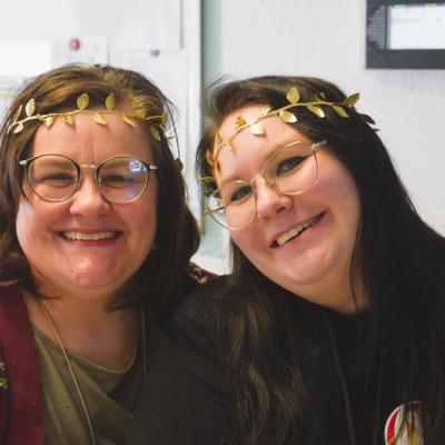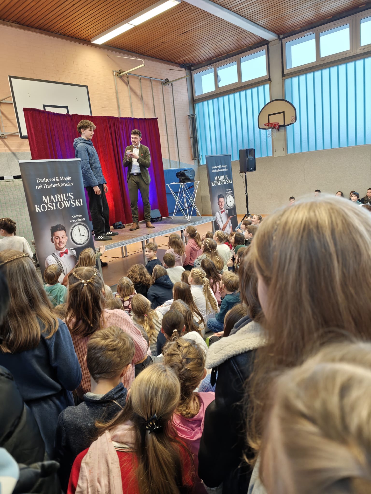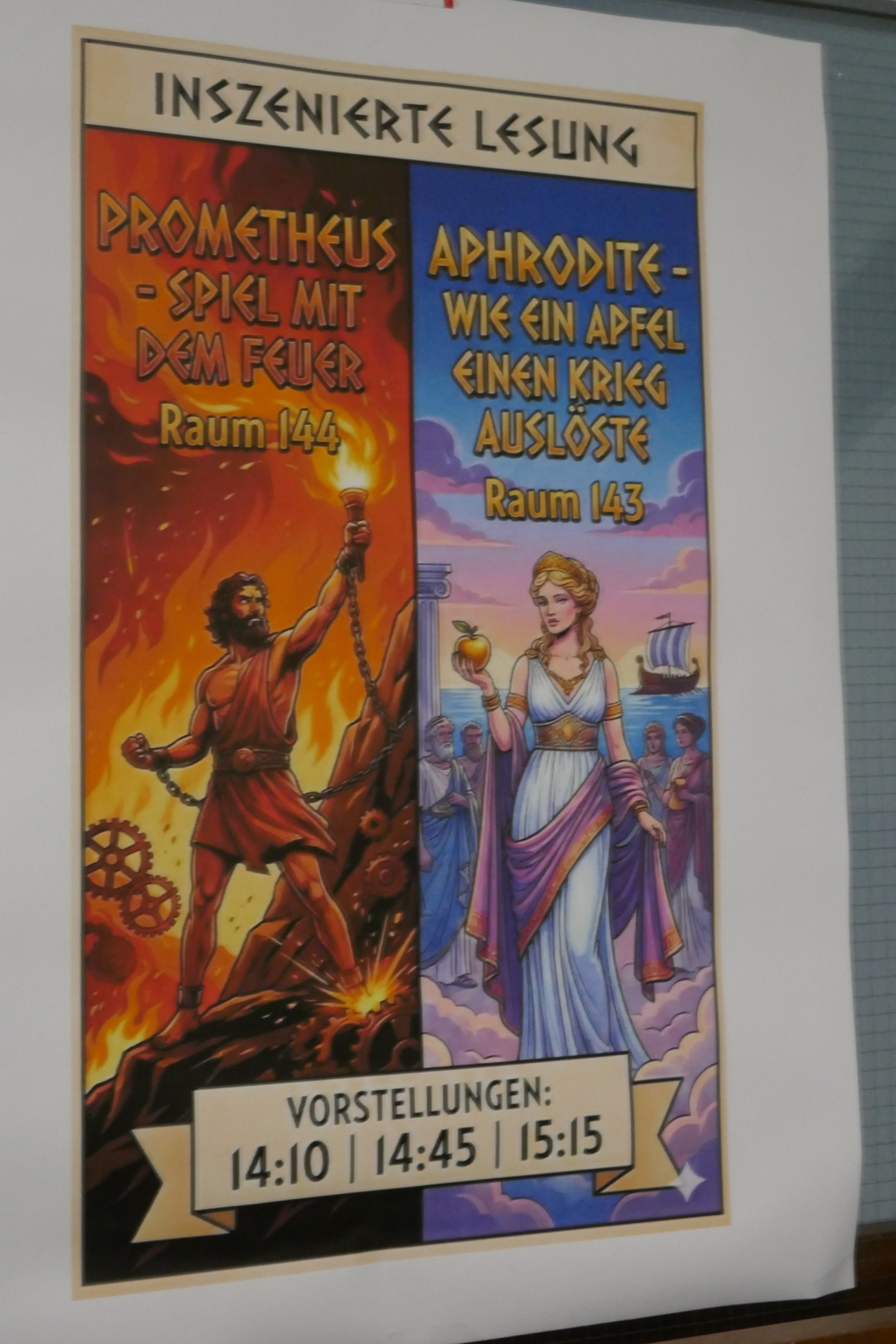 Auch in diesem Jahr folgten zahlreiche Gäste der Einladung in das GCE, um sich z.B. im antiken Schönheitssalon ein neues Styling verpassen zu lassen, eine Rundmühle oder ein selbst gestaltetes Mosaik zu basteln oder per VR-Brille einen digitalen Gang über das Forum Romanum zu wagen. Daneben sorgten römische Spiele und das Ausprobieren von Roboterwagenrennen für zusätzliche Unterhaltung. Für die Freunde von antiken Mythen gab es mit zwei Theaterstücken zu „Prometheus“ und „Aphrodite“ viel zu sehen. Marius Koslowski, der im ersten Halbjahr als Referendar an unserer Schule war, sorgte zudem mit seiner Zaubershow in der Turnhalle für ein echtes Highlight an diesem Tag.