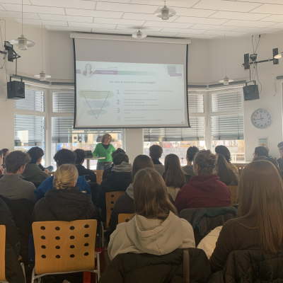Das Botschafter-Team zeigte den Schülerinnen und Schülern hierbei zunächst unterschiedliche Aspekte des Lehrberufs auf, um ein realistisches, umfassendes Bild von den Anforderungen und Chancen zu vermitteln. Die anschließende Darstellung ihres persönlichen Werdegangs sowie wertvolle Erfahrungen aus dem eigenen Lehreralltag motivierten die Zuhörerschaft dazu, über die zukünftige Tätigkeit als Lehrkraft nachzudenken. Abschließend stand das Team für einen Austausch zur Verfügung, um es den Schülerinnen und Schülern zu ermöglichen, Fragen und Bedenken offen zu äußern, aber auch um mögliche zukünftige Praktika an den unterschiedlichen Schularten zu planen.